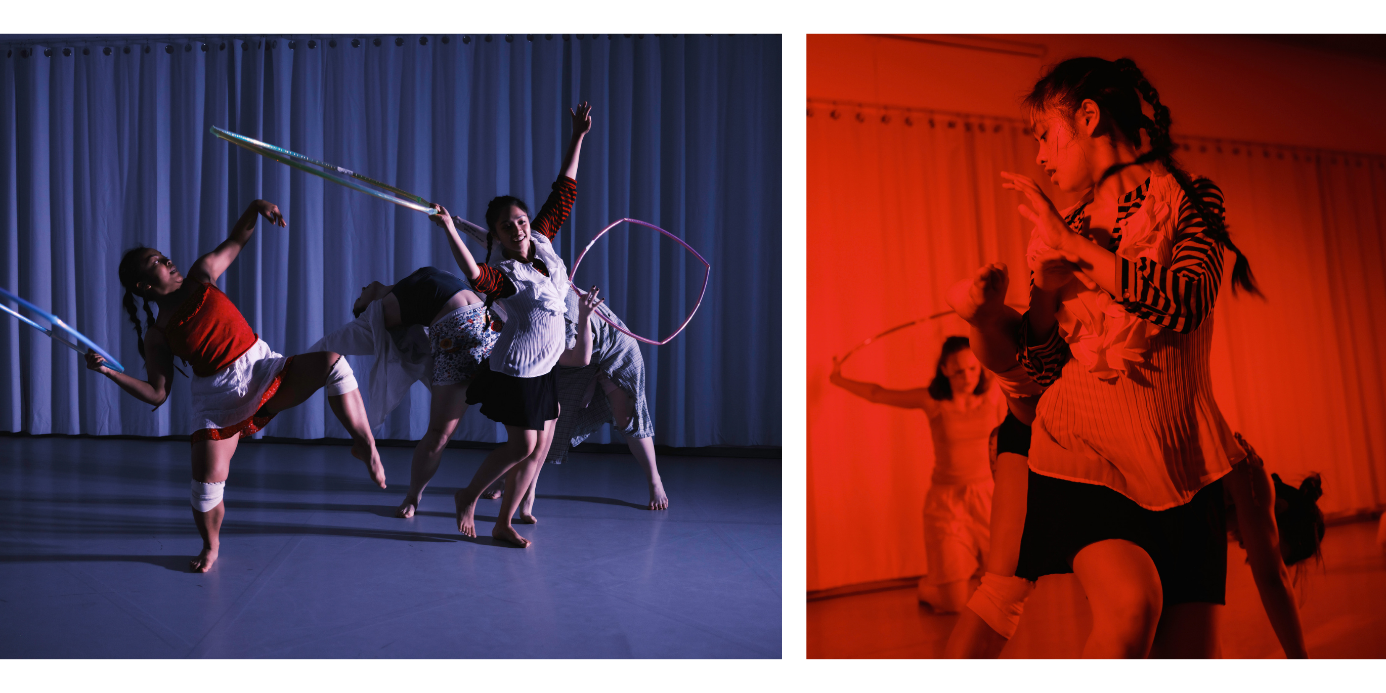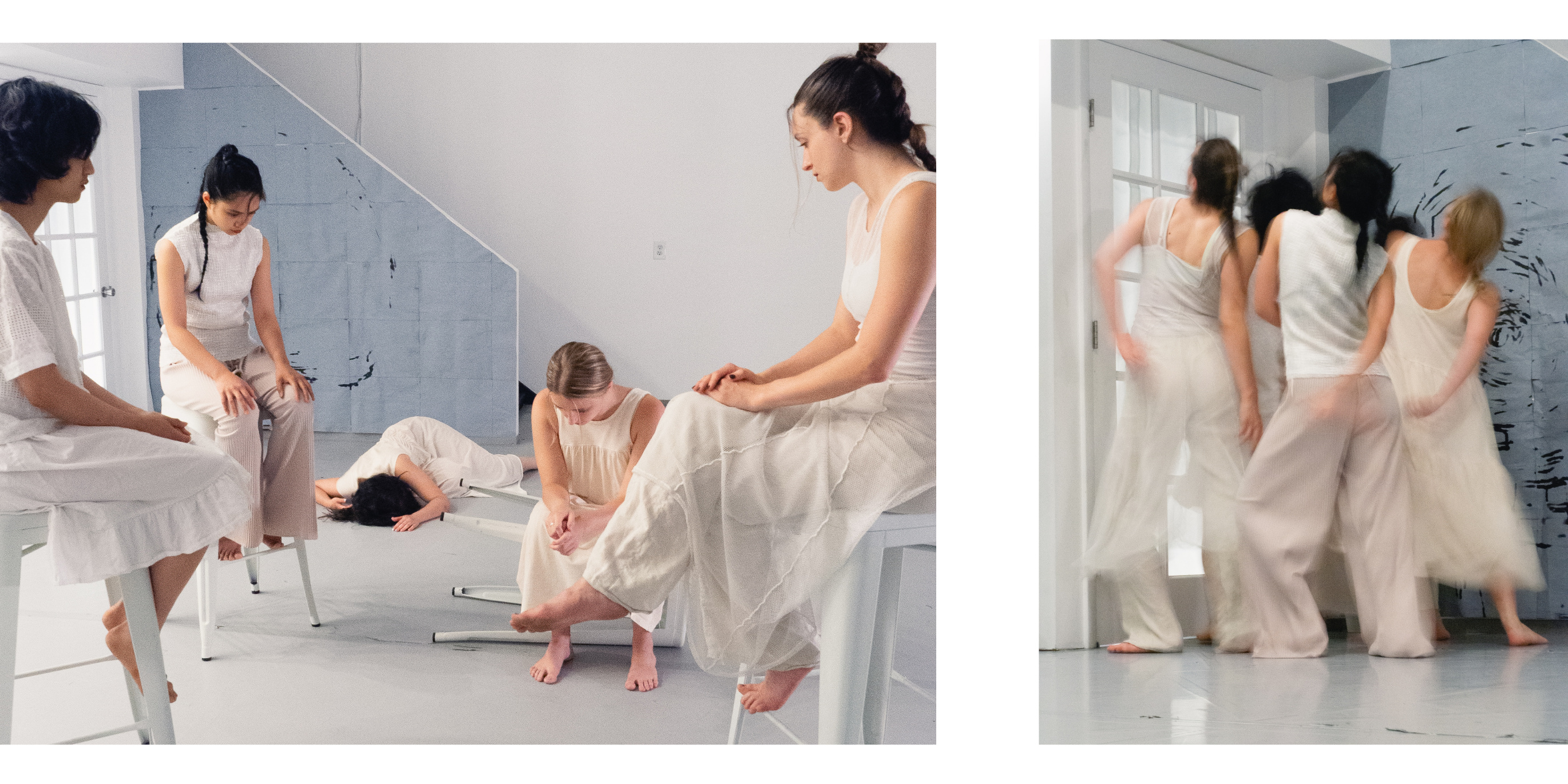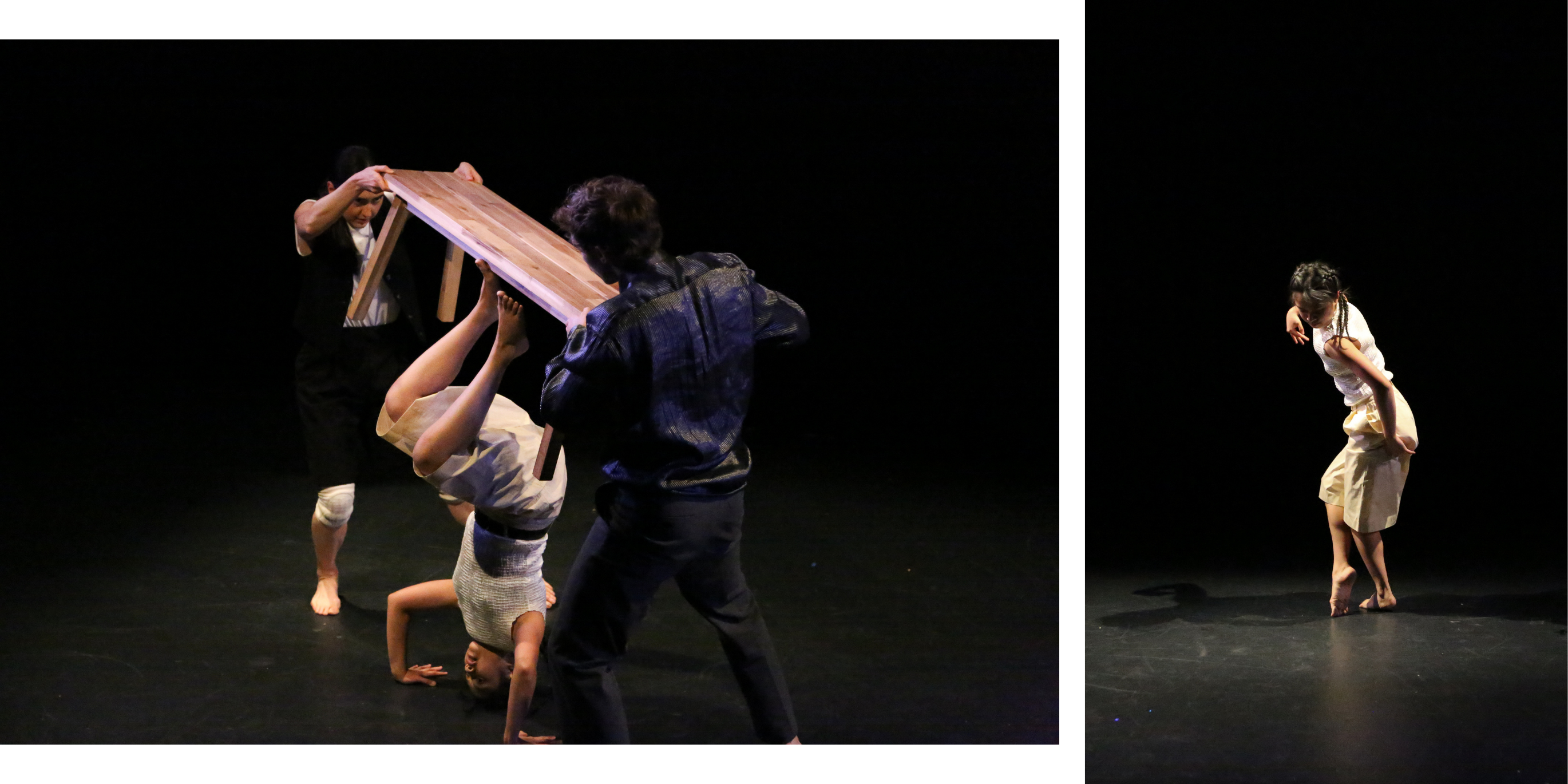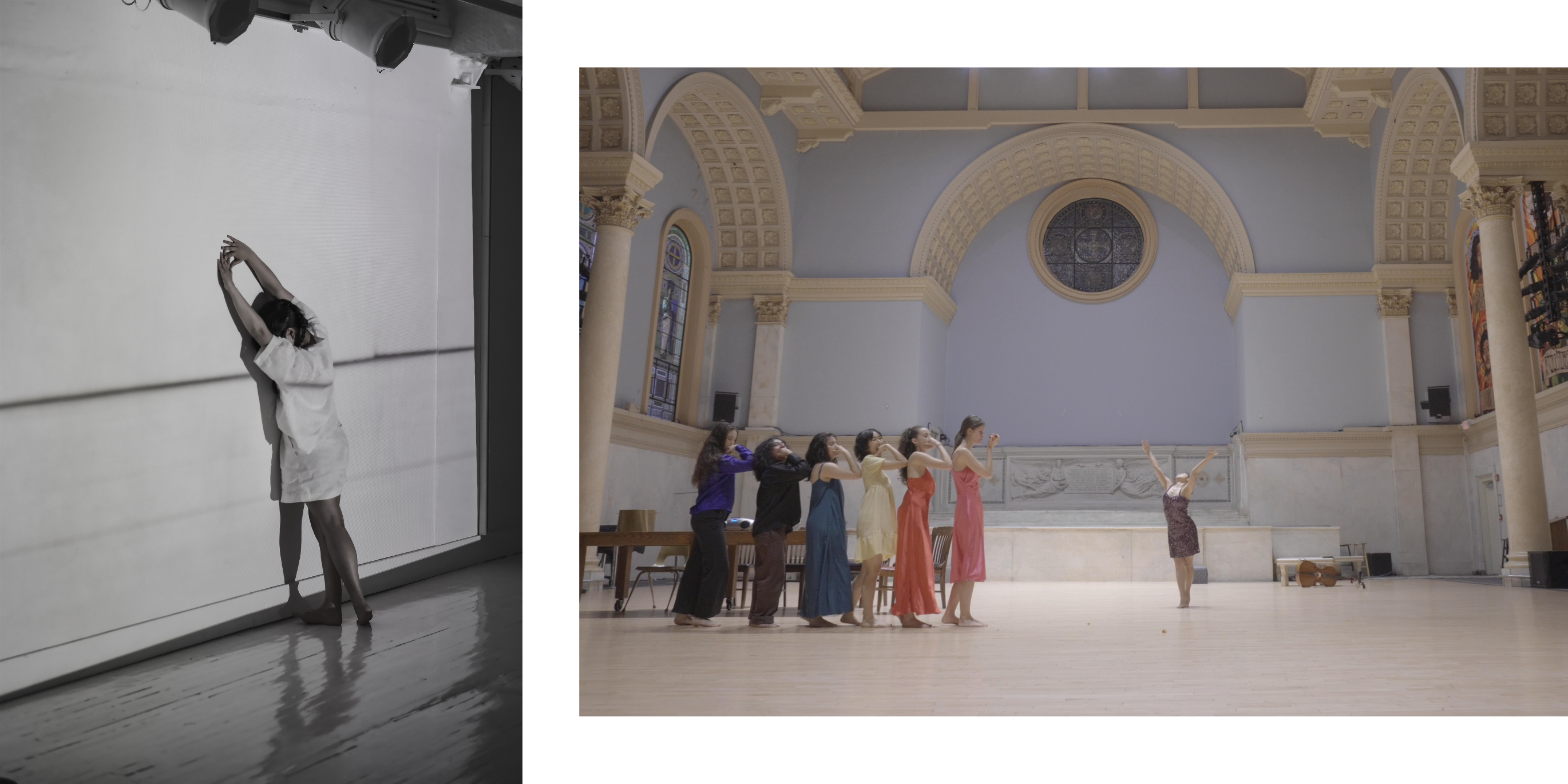 L:In “Point (in Time)” workshop performance by Yoko Murakami at Theater Lab in New York, NY. Photography by Raven Khau. R: In “how to slip into paradise with everyone watching” directed by Natalia Fernandez at Judson Memorial Church in New York, NY. Video still from Trang Doan.